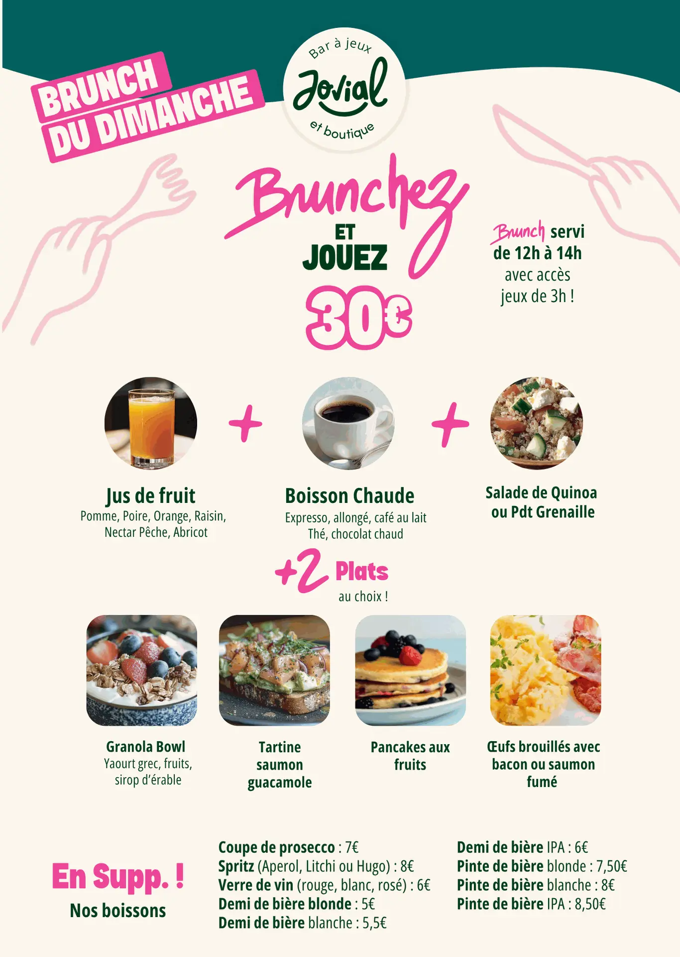 Chaque dimanche midi, place au brunch chez JOVIAL : une formule généreuse et gourmande à déguster en jouant, entre amis ou en famille.